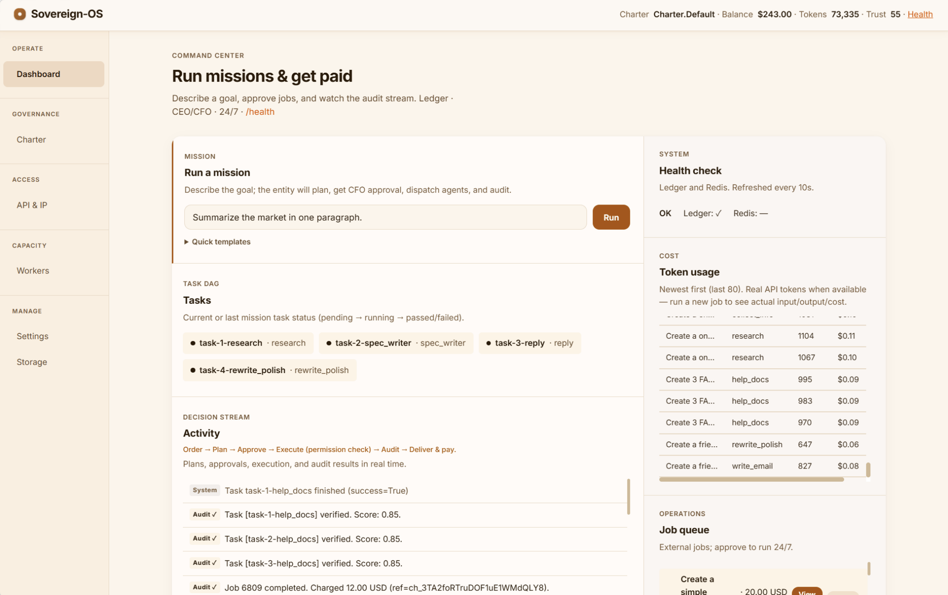 As AI agents evolve from text generators into autonomous economic actors that accept jobs, manage budgets, and delegate to sub-agents, the absence of runtime governance becomes a critical gap. Existing frameworks orchestrate agent behavior but impose no fiscal constraints, require no earned permissions, and offer no tamper-evident audit trail. We introduce Sovereign-OS, a governance-first operating system that places every agent action under constitutional control. A declarative Charter (YAML) defines mission scope, fiscal boundaries, and success criteria. A CEO (Strategist) decomposes goals into dependency-aware task DAGs; a CFO (Treasury) gates each expenditure against budget caps, daily burn limits, and profitability floors via an auction-based bidding engine; Workers operate under earned-autonomy permissions governed by a dynamic TrustScore; and an Auditor (ReviewEngine) verifies outputs against Charter KPIs, sealing each report with a SHA-256 proof hash. Across our evaluation suite, Sovereign-OS blocks 100% of fiscal violations (30 scenarios), achieves 94% correct permission gating (200 trust-escalation missions), and maintains zero integrity failure over 1,200+ audit reports. The system further integrates Stripe for real-world payment processing, closing the loop from task planning to revenue collection. Our live demonstration walks through three scenarios: loading distinct Charters to observe divergent agent behavior, triggering CFO fiscal denials under budget and profitability constraints, and escalating a new worker's TrustScore from restricted to fully authorized with on-the-spot cryptographic audit verification.